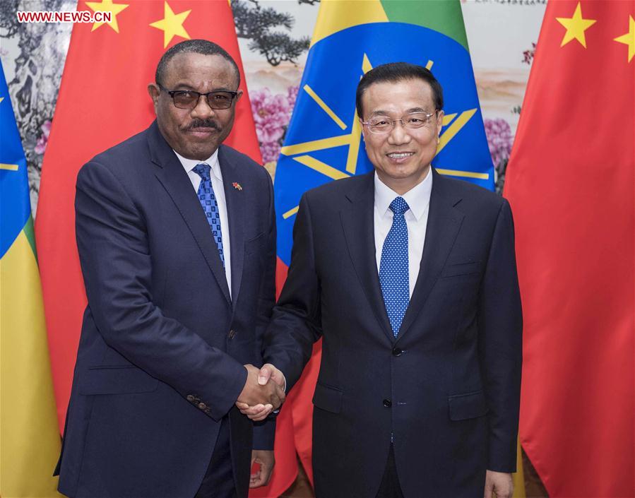 Chinese Premier Li Keqiang (R) meets with Ethiopian Prime Minister Hailemariam Desalegn in Beijing, capital of China, May 12, 2017. Hailemariam is in Beijing to attend the upcoming Belt and Road Forum for International Cooperation. (Xinhua/Li Tao)