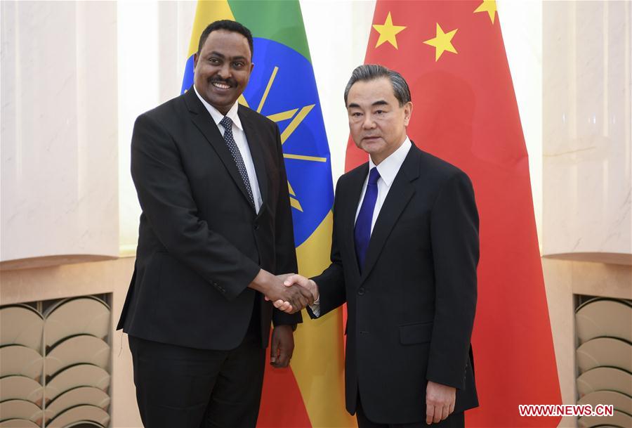 Chinese Foreign Minister Wang Yi (R) meets with Ethiopian Minister of Foreign Affairs Workineh Gebeyehu in Beijing, capital of China, May 12, 2017. Workineh Gebeyehu is in Beijing to accompany Ethiopian Prime Minister Hailemariam Desalegn to attend the upcoming Belt and Road Forum for International Cooperation. (Xinhua/Wu Xiaoling)