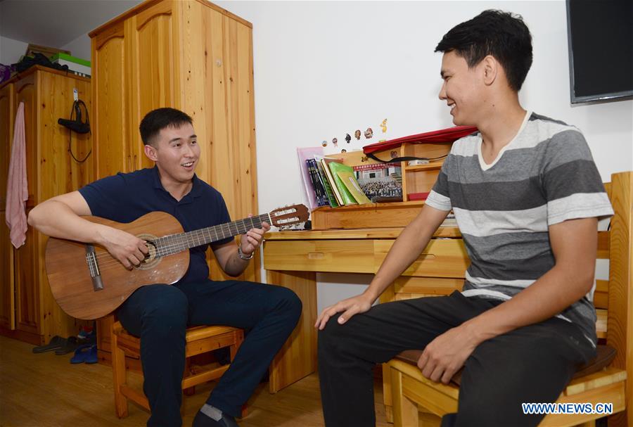 Kazakhstan's students Marat Muratkhan (L) and Abdessan Rauan play the guitar in dormitory in Northwest Agriculture and Forestry University in Yangling, northwest China's Shaanxi Province, Sept. 5, 2018. (Xinhua/Li Yibo)