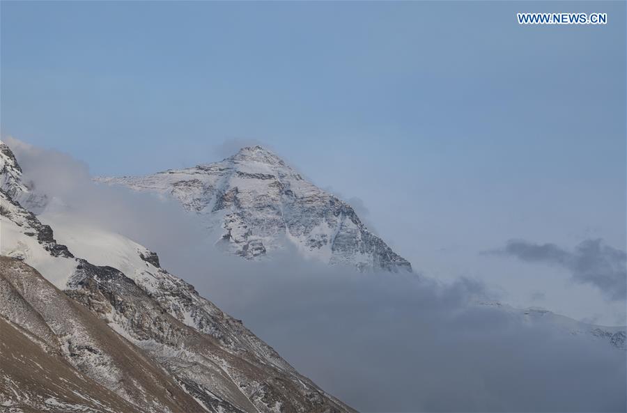 Photo taken on April 15, 2020 shows that clouds swirl around the Mount Qomolangma. (Xinhua/Sun Fei)