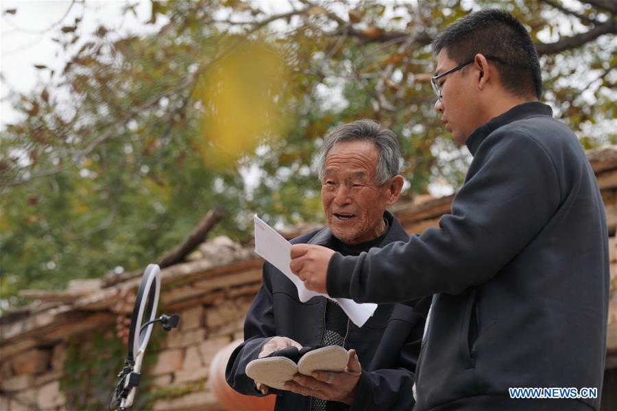 Villager Li Sanping (L) prepares his lines for a live streaming at Dakang Village of Chaiguan Township in Shahe City, north China's Hebei Province, Oct. 28, 2020. Dakang Village, over 1,000 meters above sea level, is located deep in the Taihang Mountains, which ranges across Beijing and the provinces of Hebei, Shanxi and Henan. Living in this almost inaccessible rural backwater, villagers were nearly cut off from the outside world. Over generations, they have tilled a few lands on mountains making little money. In recent years, all young people of the village have gone outside for work, with only a few old people left. Li Sanping is among those elders. He was once the village Party secretary, who led the village to develop. In 2018, the village began to develop special agricultural products industry and tourism, thanks to local government's preferential policies to support agriculture. Earlier this year, Li Sanping joined his son Li Qingbin's smartphone live streaming to promote the village's agricultural products, which are greatly welcomed by netizens. After his mobile phone debut, Li was deeply attracted by this new trend. With his son's help, Li registered an online live streaming account and bought some basic equipment, taking to promoting his village's tourism resources and specialities. Now, Li's every live streaming session would draw more than 2,000 viewers, making him a local online celebrity. With his efforts, the village has sold more agricultural products than ever, and saw an increasing number of tourists. (Xinhua/Mu Yu)