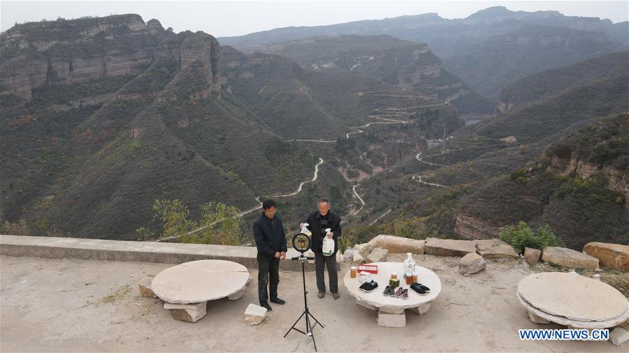 Aerial photo shows villager Li Sanping (R) promoting local specialities through live streaming at Dakang Village of Chaiguan Township in Shahe City, north China's Hebei Province, Oct. 28, 2020. Dakang Village, over 1,000 meters above sea level, is located deep in the Taihang Mountains, which ranges across Beijing and the provinces of Hebei, Shanxi and Henan. Living in this almost inaccessible rural backwater, villagers were nearly cut off from the outside world. Over generations, they have tilled a few lands on mountains making little money. In recent years, all young people of the village have gone outside for work, with only a few old people left. Li Sanping is among those elders. He was once the village Party secretary, who led the village to develop. In 2018, the village began to develop special agricultural products industry and tourism, thanks to local government's preferential policies to support agriculture. Earlier this year, Li Sanping joined his son Li Qingbin's smartphone live streaming to promote the village's agricultural products, which are greatly welcomed by netizens. After his mobile phone debut, Li was deeply attracted by this new trend. With his son's help, Li registered an online live streaming account and bought some basic equipment, taking to promoting his village's tourism resources and specialities. Now, Li's every live streaming session would draw more than 2,000 viewers, making him a local online celebrity. With his efforts, the village has sold more agricultural products than ever, and saw an increasing number of tourists. (Xinhua/Mu Yu)