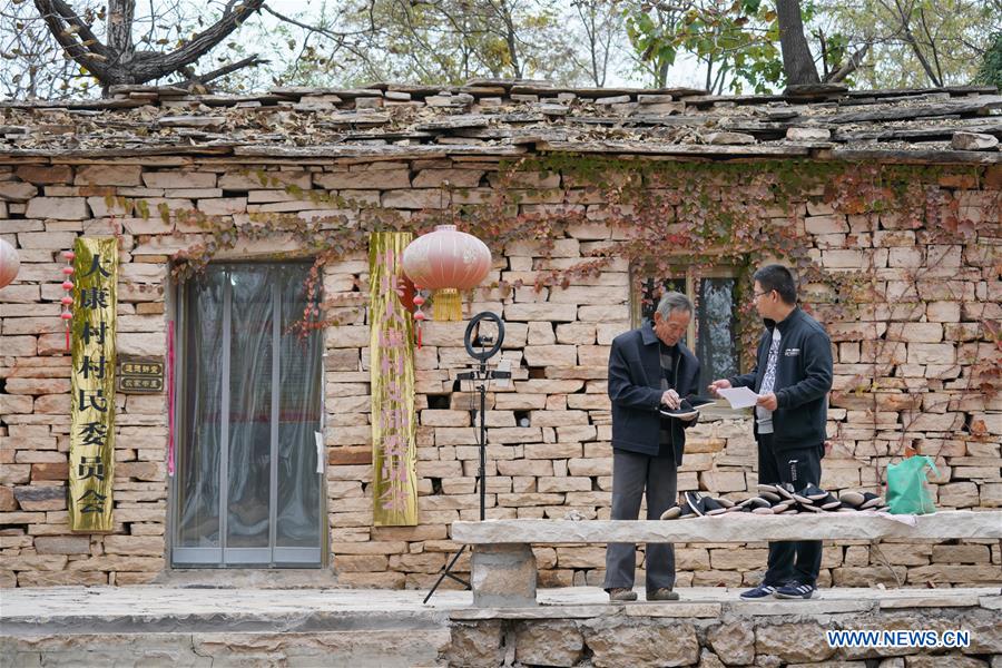 Villager Li Sanping (L) prepares for a live streaming at Dakang Village of Chaiguan Township in Shahe City, north China's Hebei Province, Oct. 28, 2020. Dakang Village, over 1,000 meters above sea level, is located deep in the Taihang Mountains, which ranges across Beijing and the provinces of Hebei, Shanxi and Henan. Living in this almost inaccessible rural backwater, villagers were nearly cut off from the outside world. Over generations, they have tilled a few lands on mountains making little money. In recent years, all young people of the village have gone outside for work, with only a few old people left. Li Sanping is among those elders. He was once the village Party secretary, who led the village to develop. In 2018, the village began to develop special agricultural products industry and tourism, thanks to local government's preferential policies to support agriculture. Earlier this year, Li Sanping joined his son Li Qingbin's smartphone live streaming to promote the village's agricultural products, which are greatly welcomed by netizens. After his mobile phone debut, Li was deeply attracted by this new trend. With his son's help, Li registered an online live streaming account and bought some basic equipment, taking to promoting his village's tourism resources and specialities. Now, Li's every live streaming session would draw more than 2,000 viewers, making him a local online celebrity. With his efforts, the village has sold more agricultural products than ever, and saw an increasing number of tourists. (Xinhua/Mu Yu)