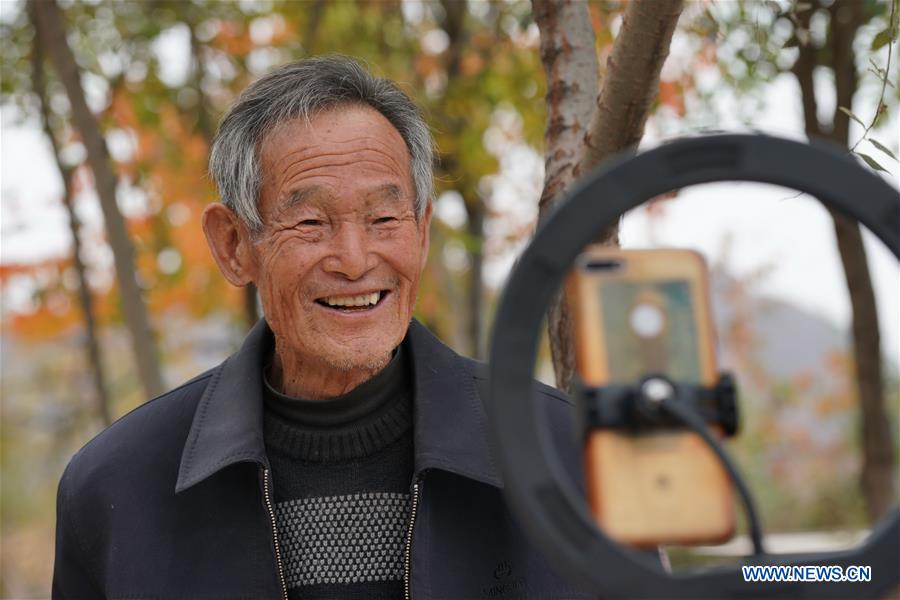 Villager Li Sanping interacts in a live streaming at Dakang Village of Chaiguan Township in Shahe City, north China's Hebei Province, Oct. 28, 2020. Dakang Village, over 1,000 meters above sea level, is located deep in the Taihang Mountains, which ranges across Beijing and the provinces of Hebei, Shanxi and Henan. Living in this almost inaccessible rural backwater, villagers were nearly cut off from the outside world. Over generations, they have tilled a few lands on mountains making little money. In recent years, all young people of the village have gone outside for work, with only a few old people left. Li Sanping is among those elders. He was once the village Party secretary, who led the village to develop. In 2018, the village began to develop special agricultural products industry and tourism, thanks to local government's preferential policies to support agriculture. Earlier this year, Li Sanping joined his son Li Qingbin's smartphone live streaming to promote the village's agricultural products, which are greatly welcomed by netizens. After his mobile phone debut, Li was deeply attracted by this new trend. With his son's help, Li registered an online live streaming account and bought some basic equipment, taking to promoting his village's tourism resources and specialities. Now, Li's every live streaming session would draw more than 2,000 viewers, making him a local online celebrity. With his efforts, the village has sold more agricultural products than ever, and saw an increasing number of tourists. (Xinhua/Mu Yu)