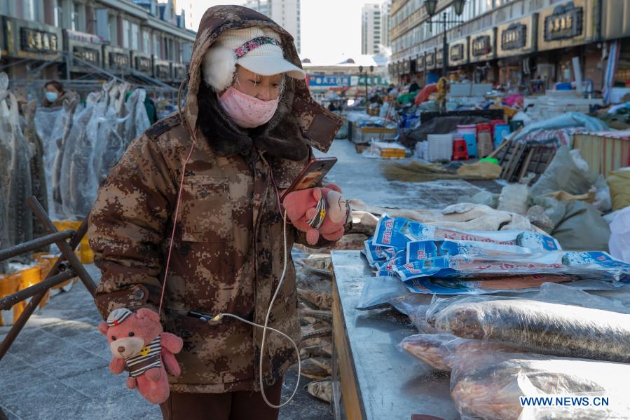 A merchant livestreams to sell frozen fish at a fish market in Fuyuan City, northeast China's Heilongjiang Province, Jan. 9, 2021. Fuyuan, the easternmost city of China, has abundant fishery resources. There is a century-old fish market in the city downtown where one can buy various fish products. (Xinhua/Zhang Tao)