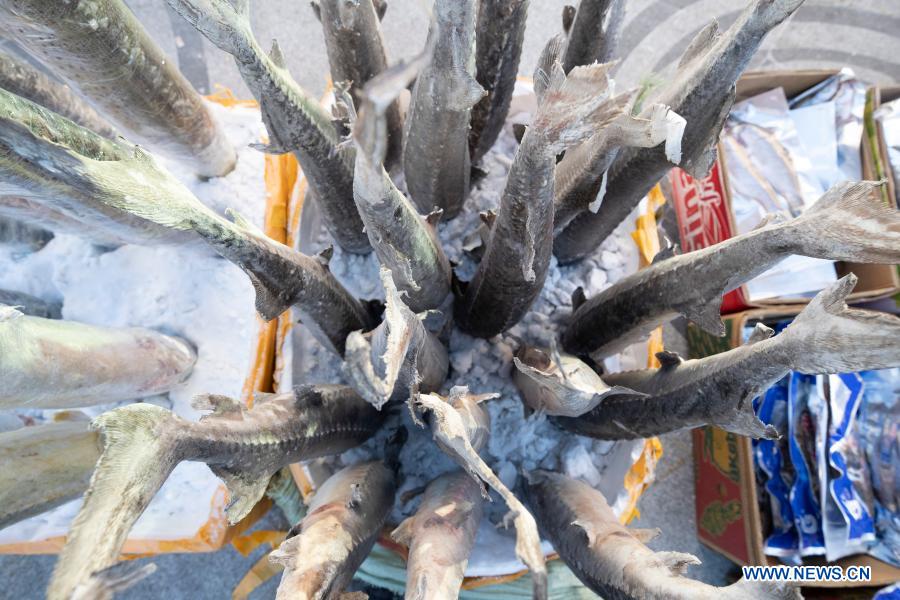 Photo shows frozen fish at a fish market in Fuyuan City, northeast China's Heilongjiang Province, Jan. 9, 2021. Fuyuan, the easternmost city of China, has abundant fishery resources. There is a century-old fish market in the city downtown where one can buy various fish products. (Xinhua/Zhang Tao)