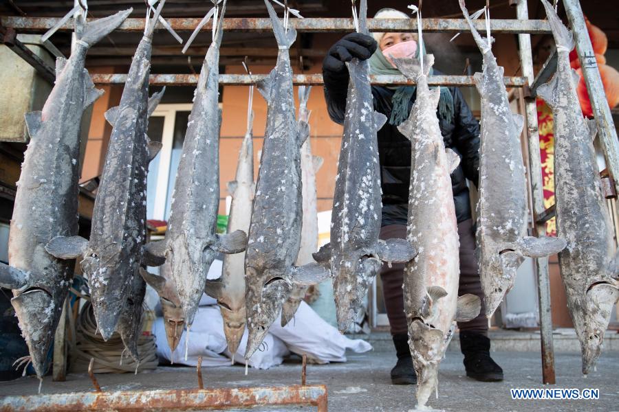 A merchant arranges frozen fish on a shelf at a fish market in Fuyuan City, northeast China's Heilongjiang Province, Jan. 9, 2021. Fuyuan, the easternmost city of China, has abundant fishery resources. There is a century-old fish market in the city downtown where one can buy various fish products. (Xinhua/Zhang Tao)
