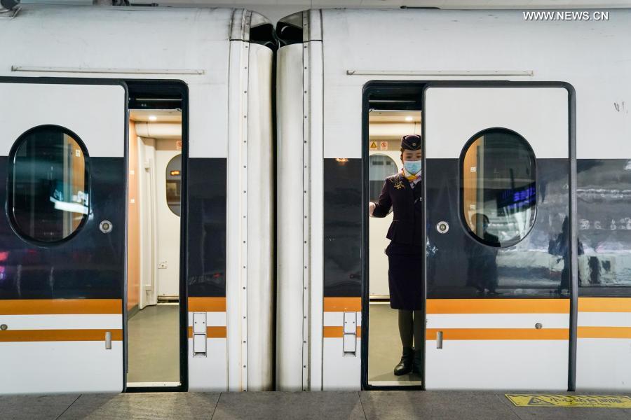 Train G598 is ready to leave Shanghai Hongqiao Railway Station in Shanghai, east China, Jan. 28, 2021. On the first day of the Spring Festival travel rush in 2021, Gao Li, a "post-90s" migrant worker in Shanghai, packed up his luggage and set foot on his way back to his hometown of Huangpi, Wuhan of central China for the Spring Festival. Before checking in, he fumbled for the negative nucleic acid testing report in his bag. Nothing could be more important than this piece of "luggage". Two days ago, Shanghai medical workers came to Gao Li's working site and conducted nucleic acid testing on more than 100 workers who planned to return home. On Jan. 27, they got their important "pass". At 7:55 this morning, train G598 left Shanghai Hongqiao Station on time. Gao stared out of the window, eager to return home. The train sped along. Gao could not wait to see his loved ones he hadn't seen for a long time. In fact, long absence is not only relatives, but also a taste of the New Year. "For us Wuhan people, there are a lot of emotions that have been stored up and we need to express them in this reunion moment," said Gao Li. Gao is an installation worker of the China Construction Third Engineering Bureau Co., Ltd. After the outbreak of the Wuhan epidemic last year, he went to Wuhan with his father Gao Yongxiang and relatives from his hometown to become the first group of builders of Wuhan Leishenshan Hospital, which was swiftly built for the treatment of COVID-19 patients. On this trip home, Gao received one nucleic acid testing, two times of whole-body disinfections, three health QR code checks and four body temperature tests. When arriving at the village committee of Shuikousi Village, local village officials checked his negative nucleic acid testing report and distributed him with epidemic prevention notices and anti-epidemic supplies. According to the relevant policies, Gao does not need any form of isolation, and only need to monitor his health conditions at home and accept routine nucleic acid testings. "Last year, the village officials said that after the epidemic, there will be a reunion year. Now I understand this truth better. Only when everyone is healthy can there be happy families and a peaceful country," Gao said. This year's Spring Festival travel rush is the first of its kind under normal epidemic prevention and control. Xinhua reporters followed Gao Li's footsteps from his working place in Shanghai to his hometown Huangpi, Wuhan, to record his way back home during the Spring Festival travel rush. (Xinhua/Ding Ting)