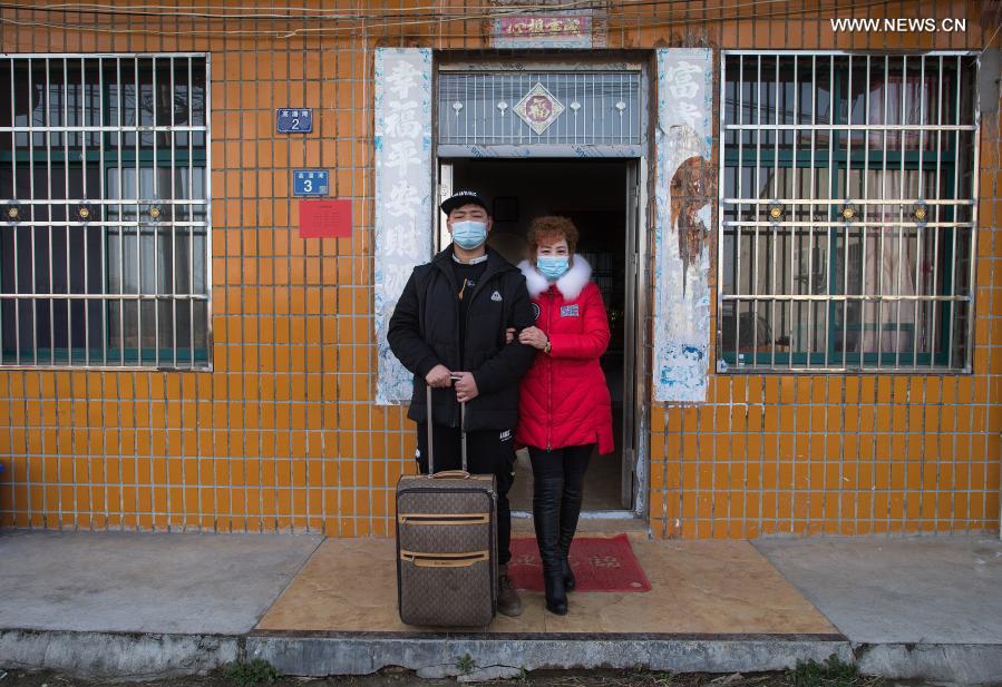 (210128) -- WUHAN, Jan. 28, 2021 (Xinhua) -- Gao Li poses for a group photo with his mother in front of his home in Shuikousi Village of Caijiazha Town, Hangpi District of Wuhan City, central China's Hubei Province, Jan. 28, 2021. On the first day of the Spring Festival travel rush in 2021, Gao Li, a "post-90s" migrant worker in Shanghai, packed up his luggage and set foot on his way back to his hometown of Huangpi, Wuhan of central China for the Spring Festival. Before checking in, he fumbled for the negative nucleic acid testing report in his bag. Nothing could be more important than this piece of "luggage". Two days ago, Shanghai medical workers came to Gao Li's working site and conducted nucleic acid testing on more than 100 workers who planned to return home. On Jan. 27, they got their important "pass". At 7:55 this morning, train G598 left Shanghai Hongqiao Station on time. Gao stared out of the window, eager to return home. The train sped along. Gao could not wait to see his loved ones he hadn't seen for a long time. In fact, long absence is not only relatives, but also a taste of the New Year. "For us Wuhan people, there are a lot of emotions that have been stored up and we need to express them in this reunion moment," said Gao Li. Gao is an installation worker of the China Construction Third Engineering Bureau Co., Ltd. After the outbreak of the Wuhan epidemic last year, he went to Wuhan with his father Gao Yongxiang and relatives from his hometown to become the first group of builders of Wuhan Leishenshan Hospital, which was swiftly built for the treatment of COVID-19 patients. On this trip home, Gao received one nucleic acid testing, two times of whole-body disinfections, three health QR code checks and four body temperature tests. When arriving at the village committee of Shuikousi Village, local village officials checked his negative nucleic acid testing report and distributed him with epidemic prevention notices and anti-epidemic supplies. According to the relevant policies, Gao does not need any form of isolation, and only need to monitor his health conditions at home and accept routine nucleic acid testings. "Last year, the village officials said that after the epidemic, there will be a reunion year. Now I understand this truth better. Only when everyone is healthy can there be happy families and a peaceful country," Gao said. This year's Spring Festival travel rush is the first of its kind under normal epidemic prevention and control. Xinhua reporters followed Gao Li's footsteps from his working place in Shanghai to his hometown Huangpi, Wuhan, to record his way back home during the Spring Festival travel rush. (Xinhua/Xiao Yijiu)