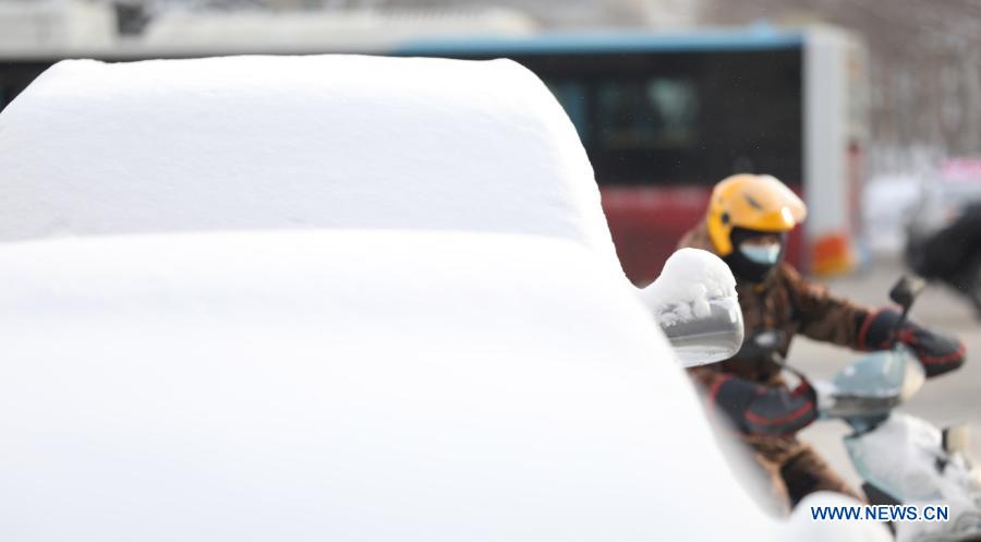 A deliveryman rides past a snow-covered car in Hunnan District of Shenyang, northeast China's Liaoning Province, Jan. 28, 2021. (Xinhua/Yao Jianfeng)