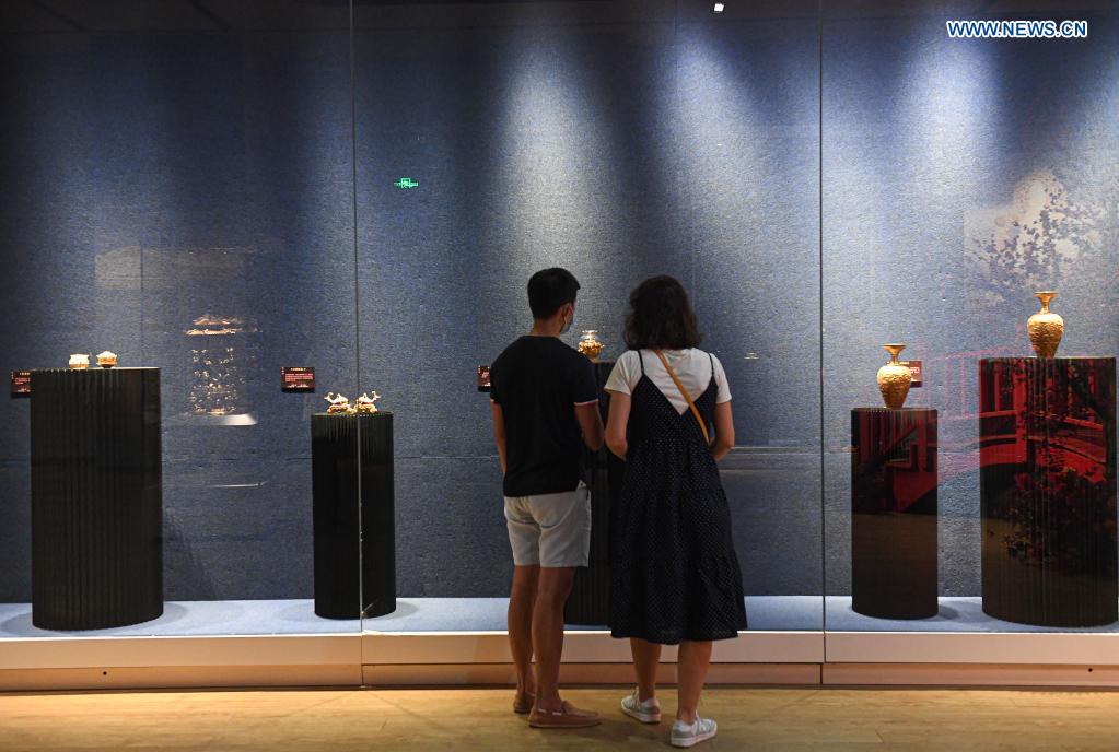 People visit an art exhibition about filigree inlay techniques at Hainan Museum in Haikou, south China's Hainan Province, March 28, 2021. An art exhibition of artworks made with filigree inlay techniques opened at Hainan Museum on Sunday. (Xinhua/Pu Xiaoxu)