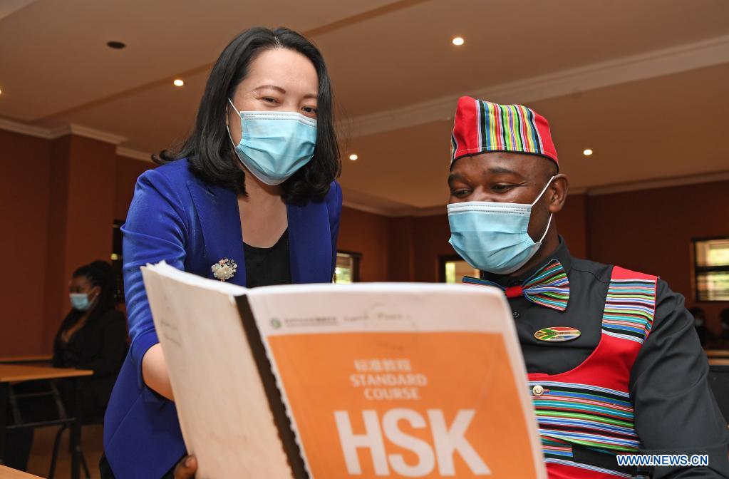 Peng Yi (L), dean of the University of Johannesburg-Nanjing Technology University Confucius Institute, gives learning advice to a South African tourist guide attending a mandarin training program offered by the University of Johannesburg-Nanjing Technology University Confucius Institute in Pretoria, South Africa, March 18, 2021. "Ni wen wo ai ni you duo shen, yue lian dai biao wo de xin (You asked me how much I loved you, the moon can represent my heart)." When hearing this Chinese song, you can hardly believe that it was sung by a group of South African tourist guides who have been learning mandarin for only two months. These 20 tourists guides were selected from all over the country by the Department of Tourism and accepted the mandarin training supplied by the University of Johannesburg-Nanjing Technology University Confucius Institute. During the training, they learned mandarin, enjoyed Chinese culture and shared their achievement and happiness with their peers. (Xinhua/Chen Cheng)