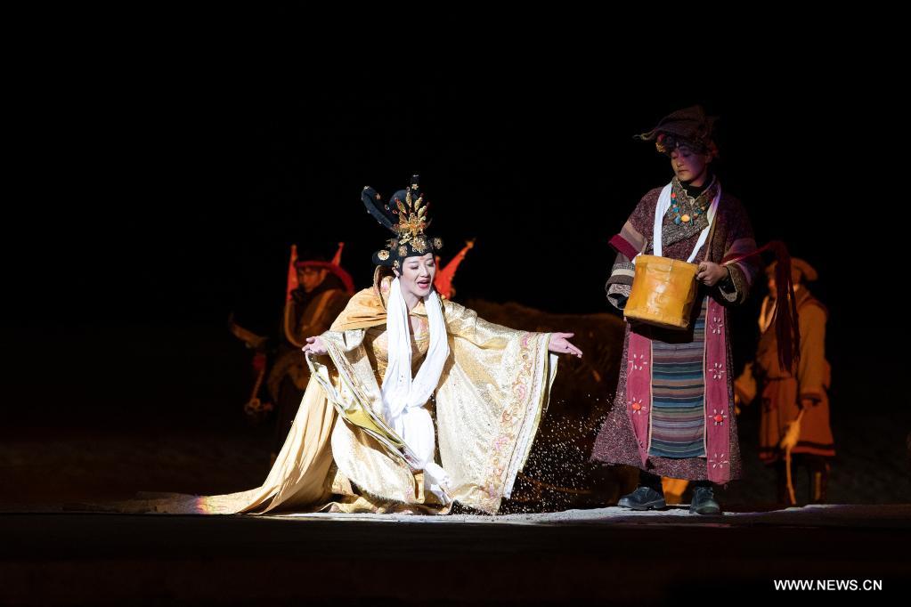 Artists perform the opera "Princess Wencheng" in Lhasa, capital of southwest China's Tibet Autonomous Region, April 10, 2021. An outdoor opera based on the life of a Tang Dynasty (618-907) princess was staged here on Saturday. The opera tells the story of Princess Wencheng, who came all the way from Chang'an (today's city of Xi'an) to marry Tibetan King Songtsen Gampo over 1,300 years ago. (Xinhua/Si Yuan)