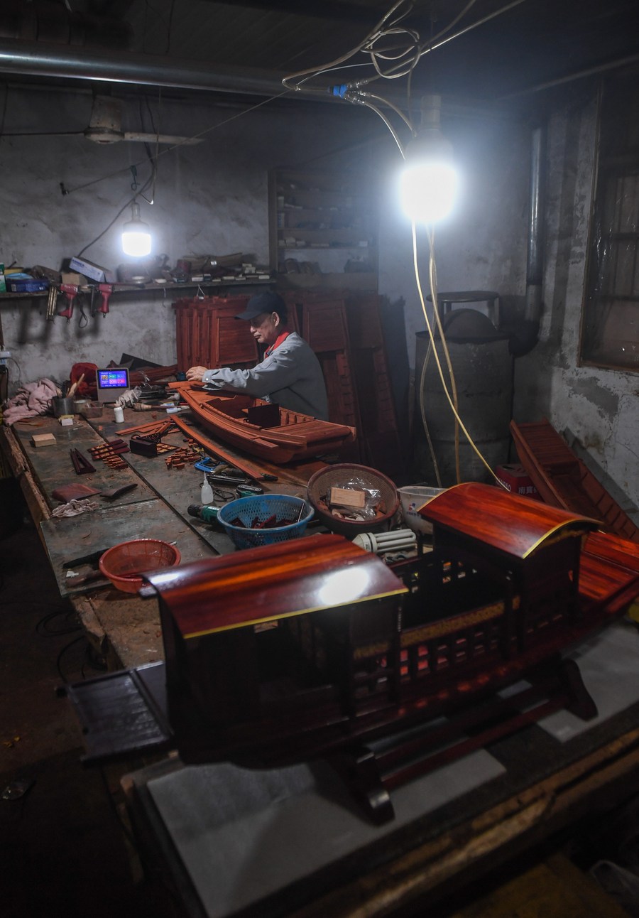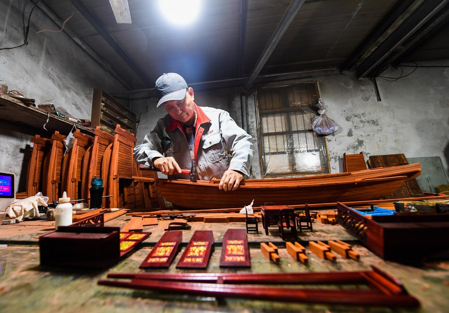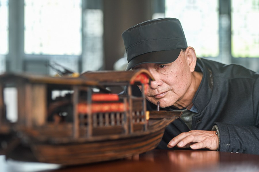 Han Minghua checks a Red Boat model at the workshop of Jiaxing Minghua Ship Model Manufacturing Co., Ltd. in Yuxin Town of Jiaxing City, east China's Zhejiang Province, April 13, 2021. (Xinhua/Jiang Han)