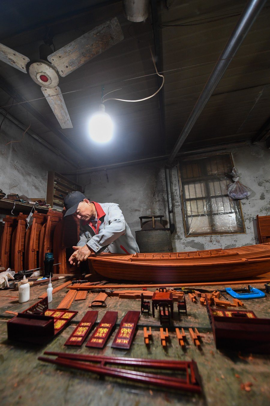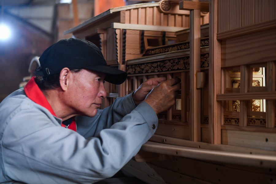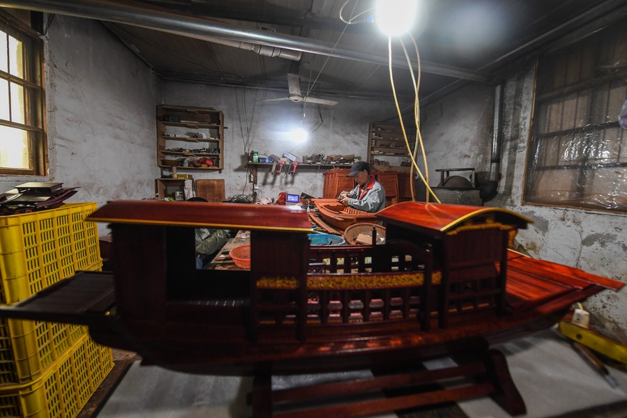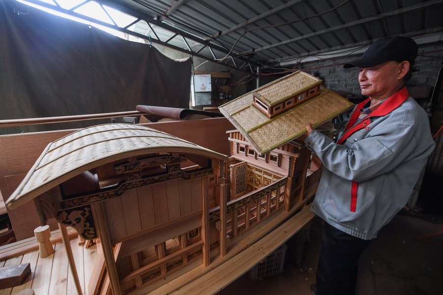 Han Minghua checks a Red Boat model at the workshop of Jiaxing Minghua Ship Model Manufacturing Co., Ltd. in Yuxin Town of Jiaxing City, east China's Zhejiang Province, April 13, 2021. (Xinhua/Xu Yu)