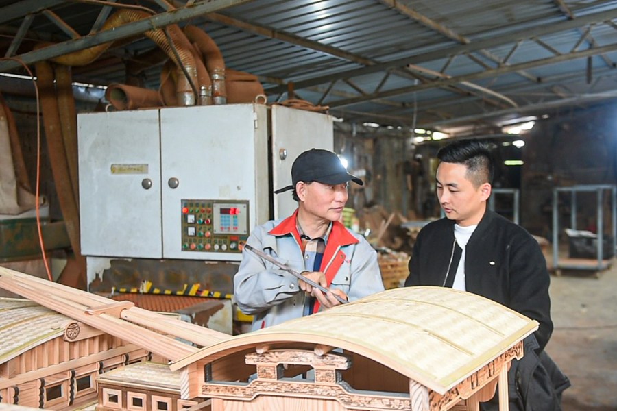 Han Minghua (L) communicates with an apprentice about making skills of Red Boat model components at the workshop of Jiaxing Minghua Ship Model Manufacturing Co., Ltd. in Yuxin Town of Jiaxing City, east China's Zhejiang Province, April 13, 2021. (Xinhua/Jiang Han)