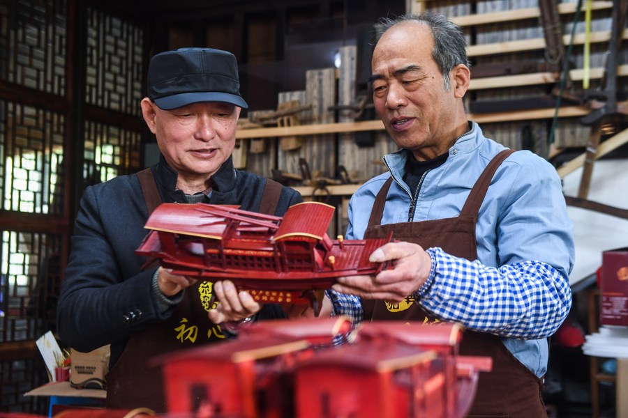 Han Minghua (L) checks a Red Boat model at the workshop of Jiaxing Minghua Ship Model Manufacturing Co., Ltd. in Yuxin Town of Jiaxing City, east China's Zhejiang Province, April 13, 2021. (Xinhua/Xu Yu)
