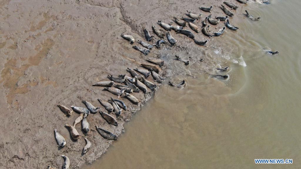 Aerial photo shows spotted seals resting on the tidal-flat area of Sandaogou in Panjin City, northeast China's Liaoning Province, April 20, 2021. Spotted seals are under Class One national protection in China. (Xinhua/Yang Qing)