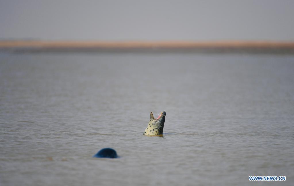 Spotted seals are seen in the sea area of Sandaogou in Panjin City, northeast China's Liaoning Province, April 20, 2021. Spotted seals are under Class One national protection in China. (Xinhua/Yang Qing)