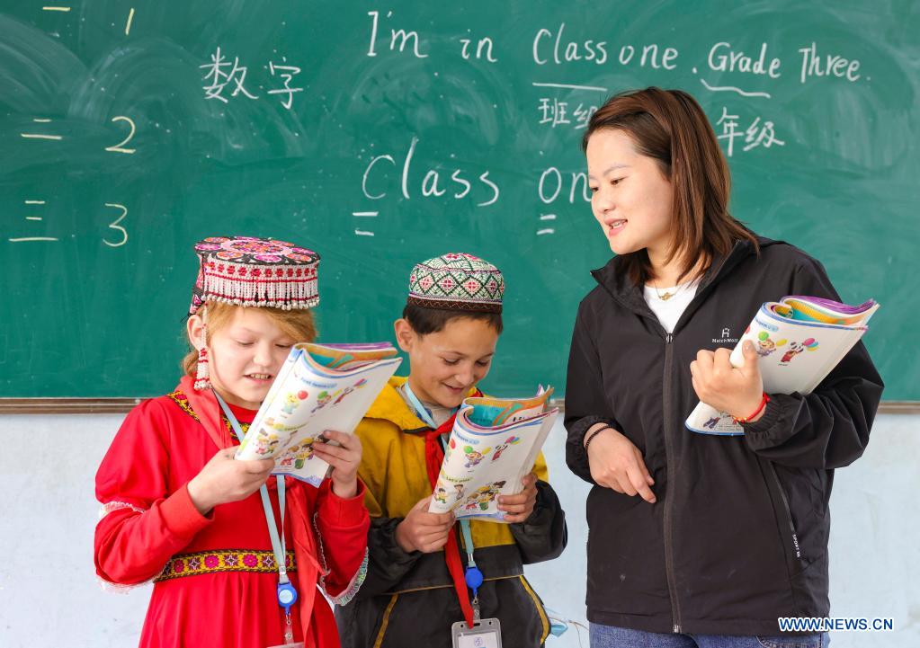 Chen Fangying teaches English at Alimalik Village of Akto County, northwest China's Xinjiang Uygur Autonomous Region, May 12, 2021. Chen Fangying, a 24-year-old village teacher, is from southwest China's Guizhou Province. When she graduated from college two years ago, she chose to become a teacher in Xinjiang. The primary school where Chen teaches is located in the Kunlun Mountains, more than 1,800 kilometers away from Xinjiang's capital city Urumqi. "For me, this is the life I should live in my twenties," said Chen. Chen Fangying has more than ten classes every week, including Chinese, English and Music. In addition, she is also required to work with other teachers to develop solutions to help local teachers improve their capacity. Meanwhile, Chen often communicates with parents during home visits to help improve learning environment. Chen values the studies of 14 students in third grade most. According to local education policy, starting from the fourth grade, students are required to go to the County, 380 kilometers away from the village, to enjoy higher quality education. Chen is full of expectations for these students who will enter the fourth grade this September. She insists they should read more books so that they can learn more about the world outside the mountains. In her daily teaching, she focuses on activating the classroom atmosphere through novel teaching methods, broadening students' horizons and helping them build up confidence. In recent years, more and more tourists have come to the village. In the beginning, the students were shy about talking to tourists. However, Chen always encourages them to express their ideas with confidence. Now, they are much more outgoing. Chen is genuinely happy with the growth of her students. It's meaningful for Chen that the students would remember she had taught them after they walked out of the mountains and moved to the cities. (Xinhua/Hu Huhu)