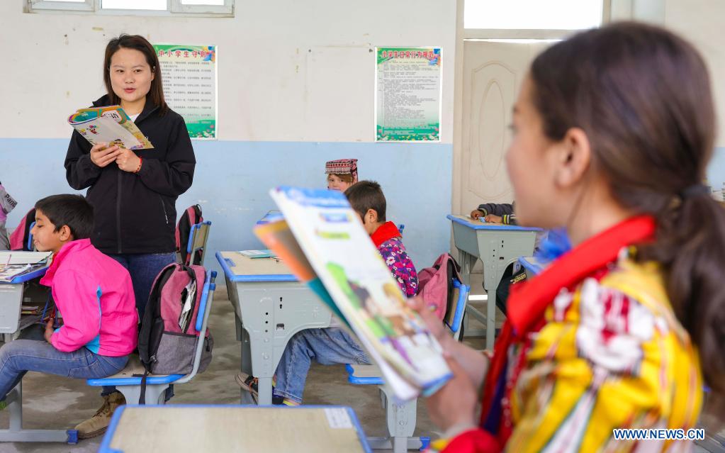 Chen Fangying answers questions during a English class at Alimalik Village of Akto County, northwest China's Xinjiang Uygur Autonomous Region, May 12, 2021. Chen Fangying, a 24-year-old village teacher, is from southwest China's Guizhou Province. When she graduated from college two years ago, she chose to become a teacher in Xinjiang. The primary school where Chen teaches is located in the Kunlun Mountains, more than 1,800 kilometers away from Xinjiang's capital city Urumqi. "For me, this is the life I should live in my twenties," said Chen. Chen Fangying has more than ten classes every week, including Chinese, English and Music. In addition, she is also required to work with other teachers to develop solutions to help local teachers improve their capacity. Meanwhile, Chen often communicates with parents during home visits to help improve learning environment. Chen values the studies of 14 students in third grade most. According to local education policy, starting from the fourth grade, students are required to go to the County, 380 kilometers away from the village, to enjoy higher quality education. Chen is full of expectations for these students who will enter the fourth grade this September. She insists they should read more books so that they can learn more about the world outside the mountains. In her daily teaching, she focuses on activating the classroom atmosphere through novel teaching methods, broadening students' horizons and helping them build up confidence. In recent years, more and more tourists have come to the village. In the beginning, the students were shy about talking to tourists. However, Chen always encourages them to express their ideas with confidence. Now, they are much more outgoing. Chen is genuinely happy with the growth of her students. It's meaningful for Chen that the students would remember she had taught them after they walked out of the mountains and moved to the cities. (Xinhua/Hu Huhu)