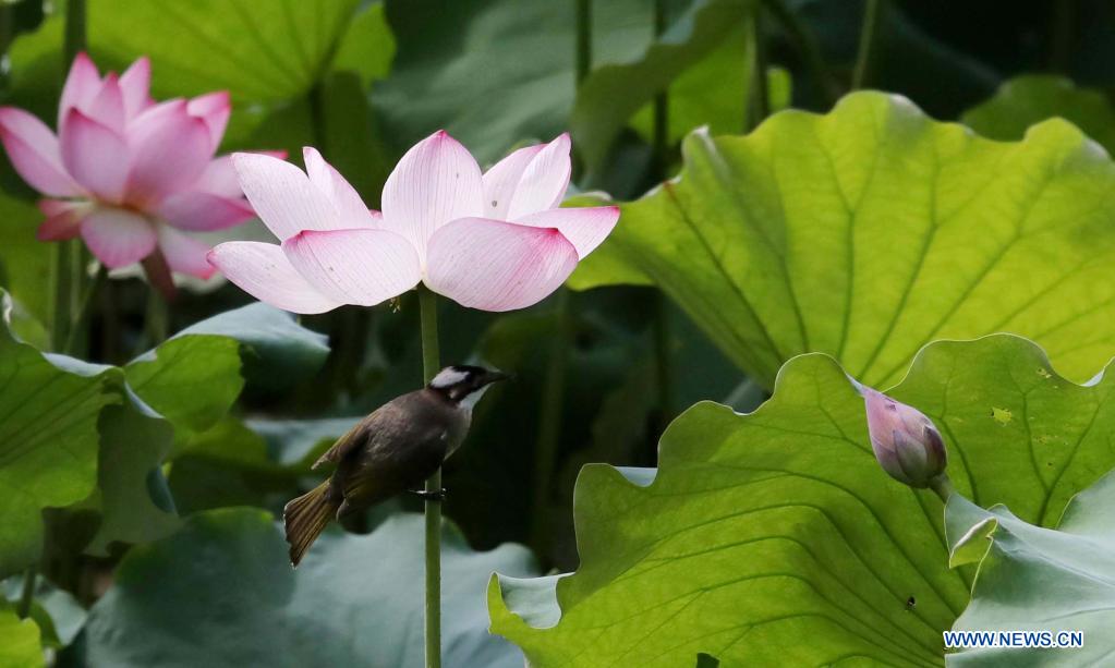 A bird rests at a lotus pond in Humble Administrator's Garden in Suzhou, east China's Jiangsu Province, June 21, 2021. (Photo by Hang Xingwei/Xinhua)