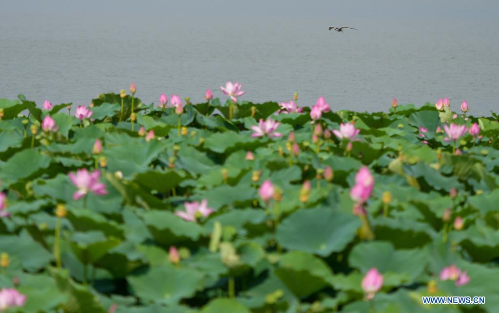Aerial photo taken on July 3, 2021 shows lotus flowers at the Baiyunhu national wetland park in Jinan, east China's Shandong Province. (Xinhua/Zhu Zheng)