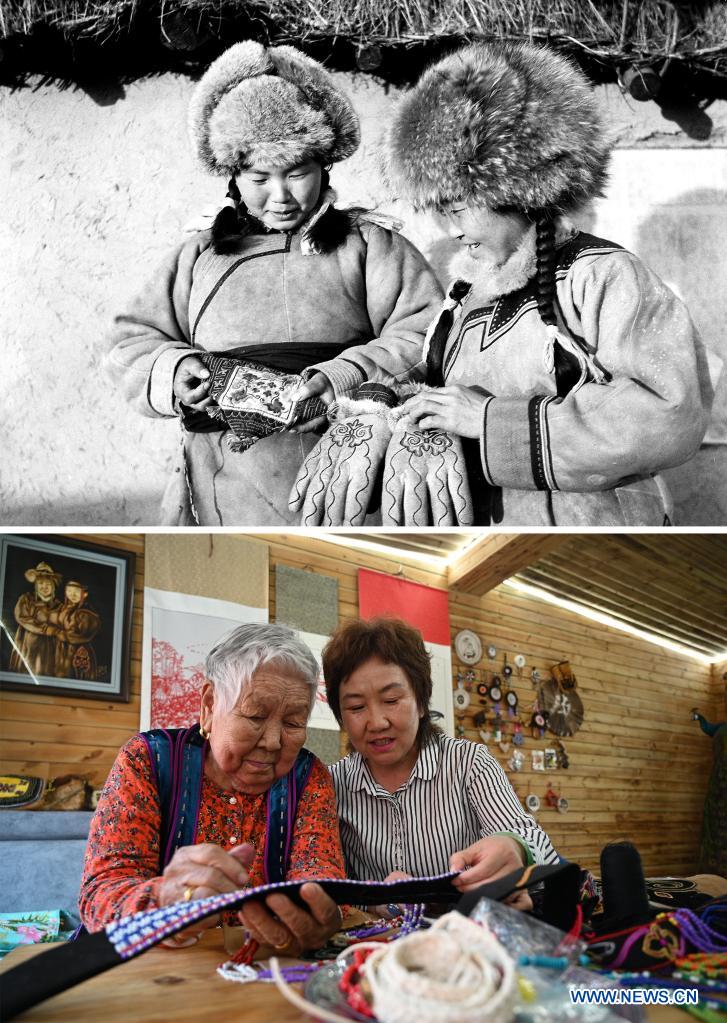 In this combo photo, the upper part taken in 1961 shows two Oroqen women making handicrafts; and the lower part taken by Lian Zhen on Aug. 5, 2021 shows Oroqen woman Ge Shumei and her daughter-in-law A Liyan checking a handmade head decoration in Ali River Township of Oroqen Autonomous Banner, north China's Inner Mongolia Autonomous Region. Oroqen, dubbed "China's last hunting ethnic minority," is one of the smallest ethnic groups in China. They used to live a nomadic life, hunting in the forests. After the establishment of the Oroqen Autonomous Banner in 1951, the lives of the Oroqen people changed for the better. By 1958, many of the region's nomads had settled down and changed the way they lived and worked. The Oroqen people made a tremendous leap from primitive tribes to modern civilization. The past seven decades have witnessed astonishing changes in their life. (Xinhua)