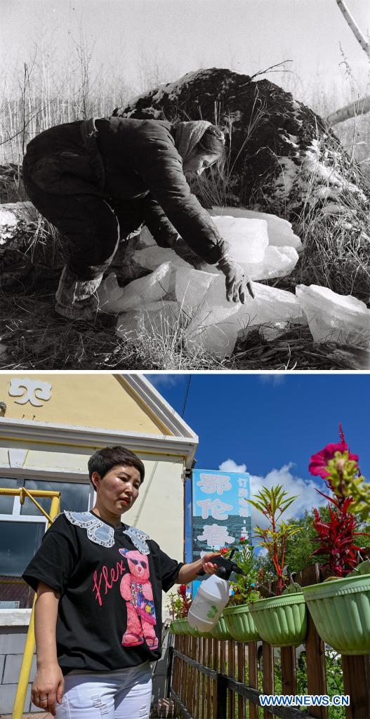 In this combo photo, the upper part taken in 1953 shows an Oroqen woman fetching ice blocks from a river for water; and the lower part taken by Lian Zhen on Aug. 6, 2021 shows villager Guan Li watering flowers at her homestay in Duobukur Village for hunting people in Dayangshu Township of Oroqen Autonomous Banner, north China's Inner Mongolia Autonomous Region. Oroqen, dubbed "China's last hunting ethnic minority," is one of the smallest ethnic groups in China. They used to live a nomadic life, hunting in the forests. After the establishment of the Oroqen Autonomous Banner in 1951, the lives of the Oroqen people changed for the better. By 1958, many of the region's nomads had settled down and changed the way they lived and worked. The Oroqen people made a tremendous leap from primitive tribes to modern civilization. The past seven decades have witnessed astonishing changes in their life. (Xinhua)