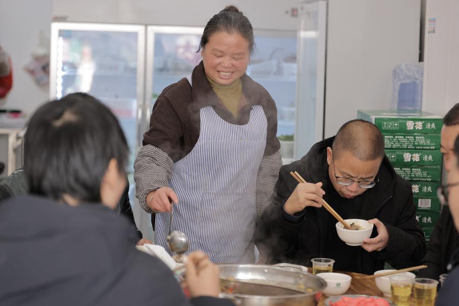 A resident (C) serves customers at her restaurant in Huajiang Town of Guanling Bouyei-Miao Autonomous County, southwest China's Guizhou Province, Nov. 5, 2025. (Xinhua/Ou Dongqu)■