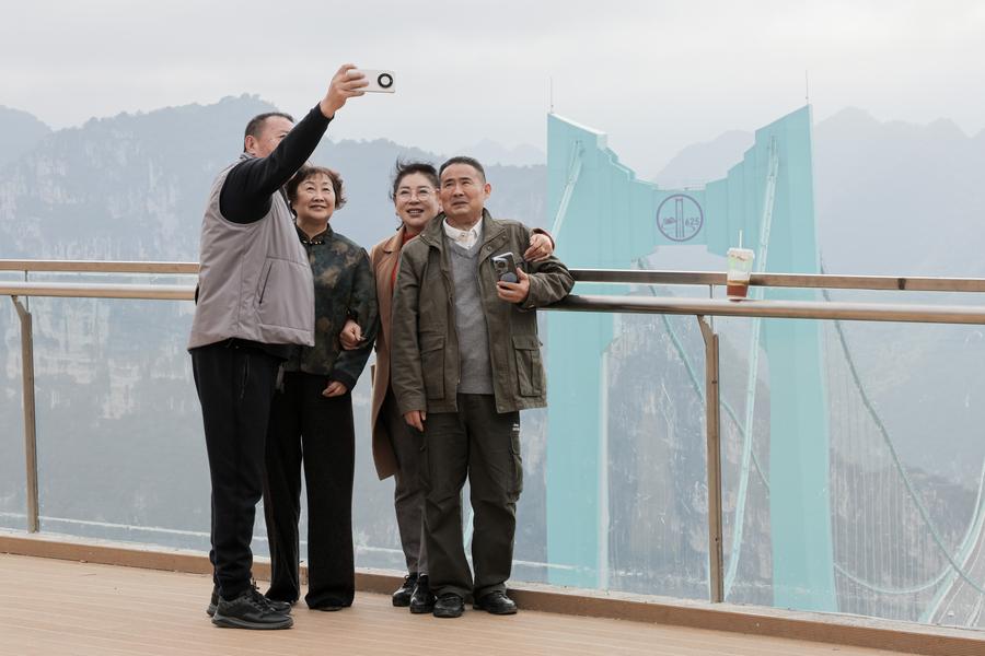 Tourists take selfies with the Huajiang Grand Canyon Bridge in Huajiang Town of Guanling Bouyei-Miao Autonomous County, southwest China's Guizhou Province, Nov. 5, 2025. (Xinhua/Ou Dongqu)