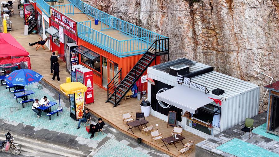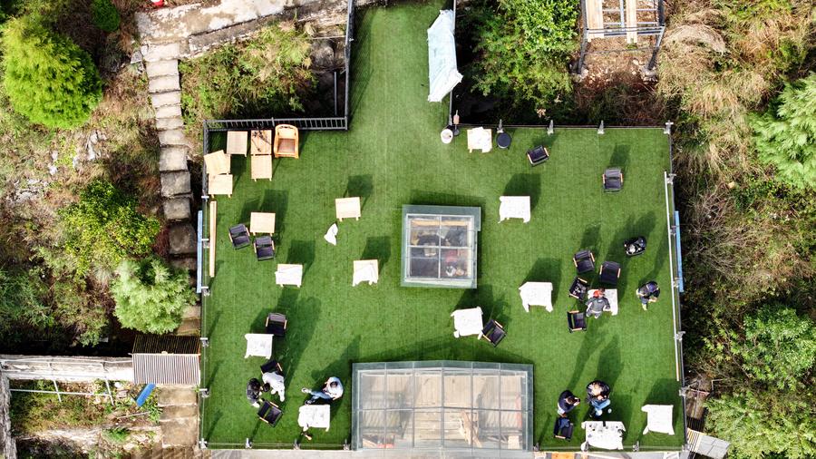 An aerial drone photo show tourists taking a rest at a coffee shop in Huajiang Town of Guanling Bouyei-Miao Autonomous County, southwest China's Guizhou Province, Nov. 5, 2025. (Xinhua/Ou Dongqu)