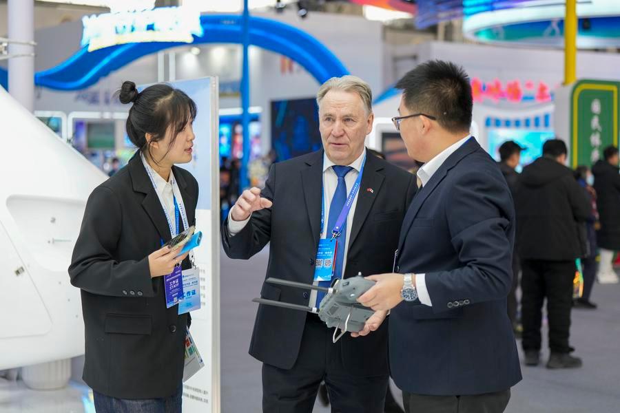 A guest (C) learns about an industrial-level drone at the Harbin International Ice and Snow Economy Expo 2026 in Harbin, northeast China's Heilongjiang Province, Jan. 6, 2026. (Xinhua/Wang Song)