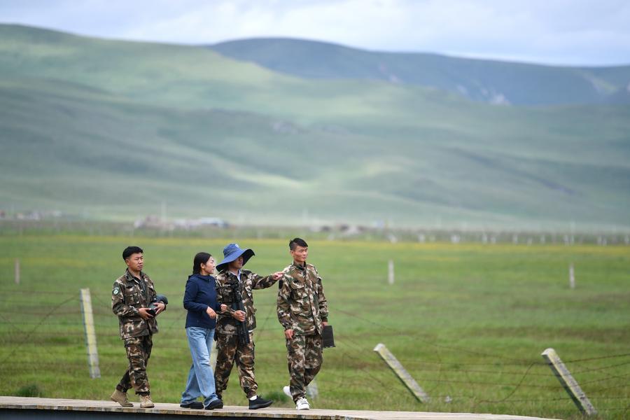 Staff members patrol the Gahai-Zecha National Nature Reserve in Gannan Tibetan Autonomous Prefecture, northwest China's Gansu Province, July 7, 2023. (Xinhua/Chen Bin)
