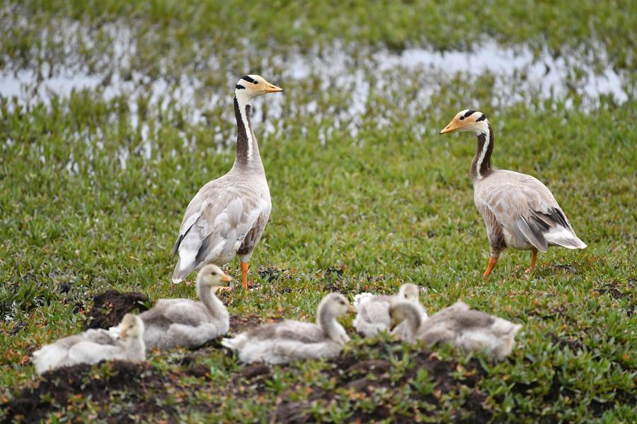 Bar-headed geese are pictured in the Gahai-Zecha National Nature Reserve in Gannan Tibetan Autonomous Prefecture, northwest China's Gansu Province, July 7, 2023. (Xinhua/Chen Bin)