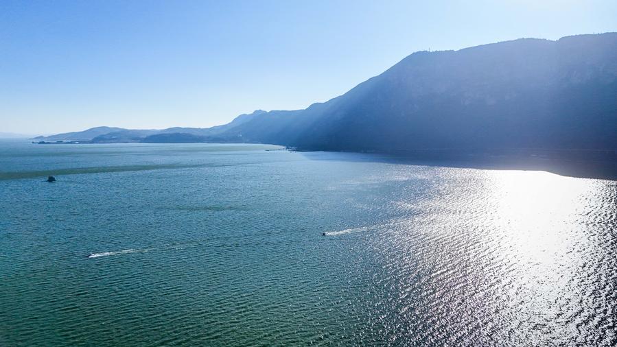 An aerial drone photo taken on Jan. 22, 2026 shows the scenery of Dianchi Lake in Kunming City, southwest China's Yunnan Province. (Xinhua/Peng Yikai)