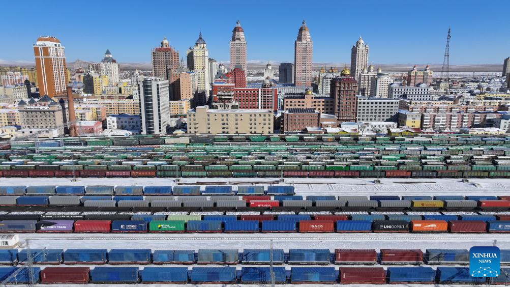 A China-Europe freight train is under shunting operation at Manzhouli Railway Station in Manzhouli City, north China's Inner Mongolia Autonomous Region, on Feb. 26, 2026. As of Feb. 26, 2026, the eastern corridor of the China-Europe freight train network has witnessed more than 1,000 train trips on its railway lines this year, breaking the mark 26 days earlier than last year.