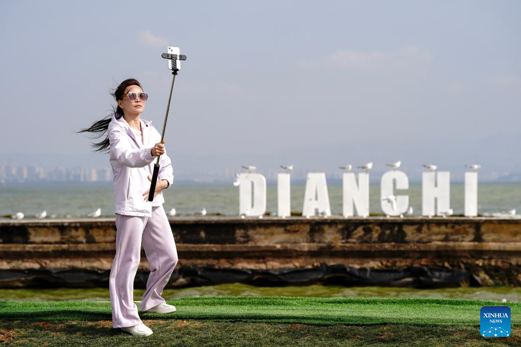 A tourist takes selfies beside the Dianchi Lake in Kunming City, southwest China's Yunnan Province, on Feb. 26, 2026. (Xinhua/Chen Xinbo)