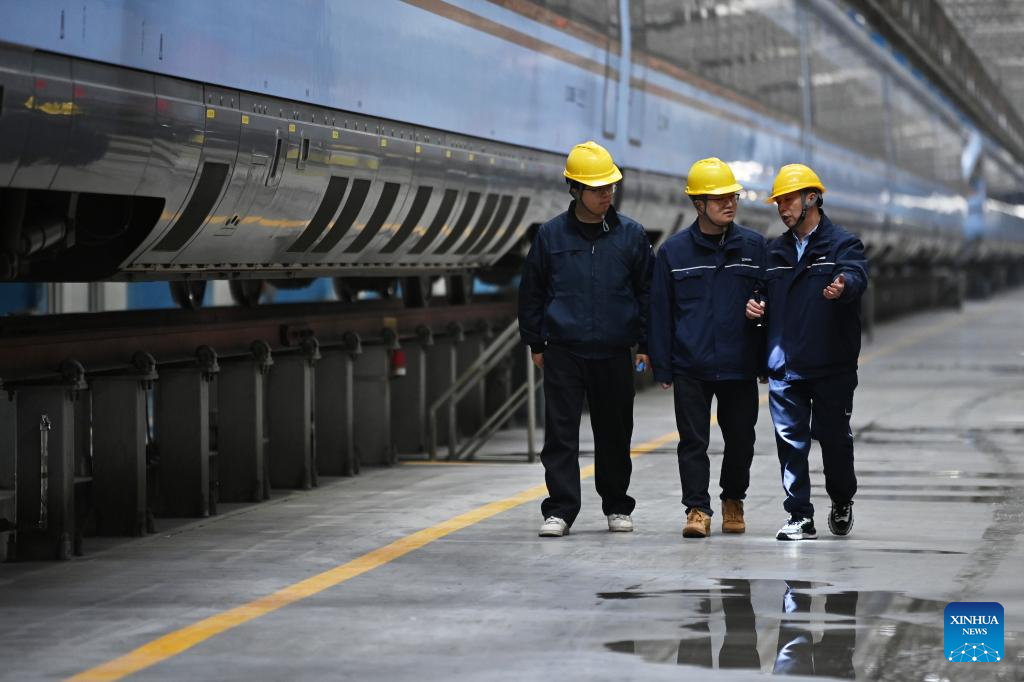 Dong Hongtao (R) and a colleague examine and maintain a bullet train at a maintenance depot of China Railway Xi'an Group Co., Ltd. in Xi'an, northwest China's Shaanxi Province, Jan. 14, 2026.