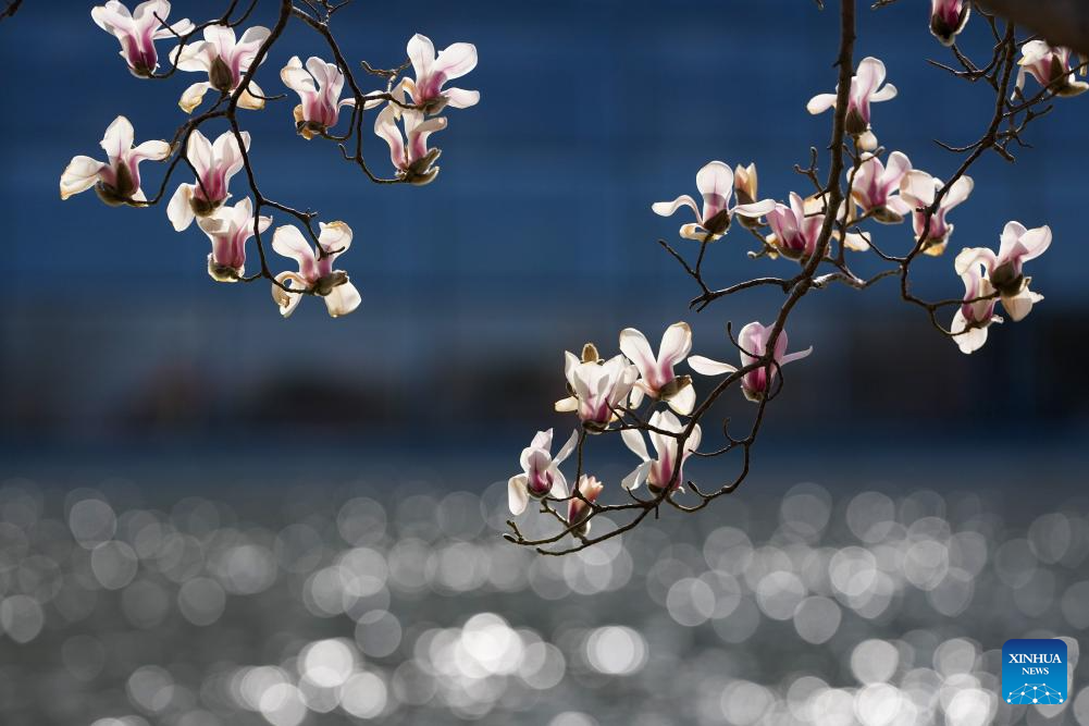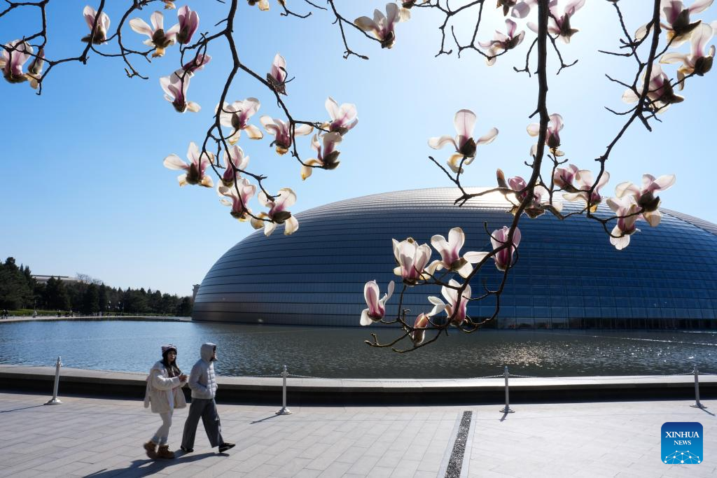 Visitors view magnolia blossoms near the National Center for the Performing Arts in Beijing, capital of China, March 9, 2026. (Xinhua/Ju Huanzong)