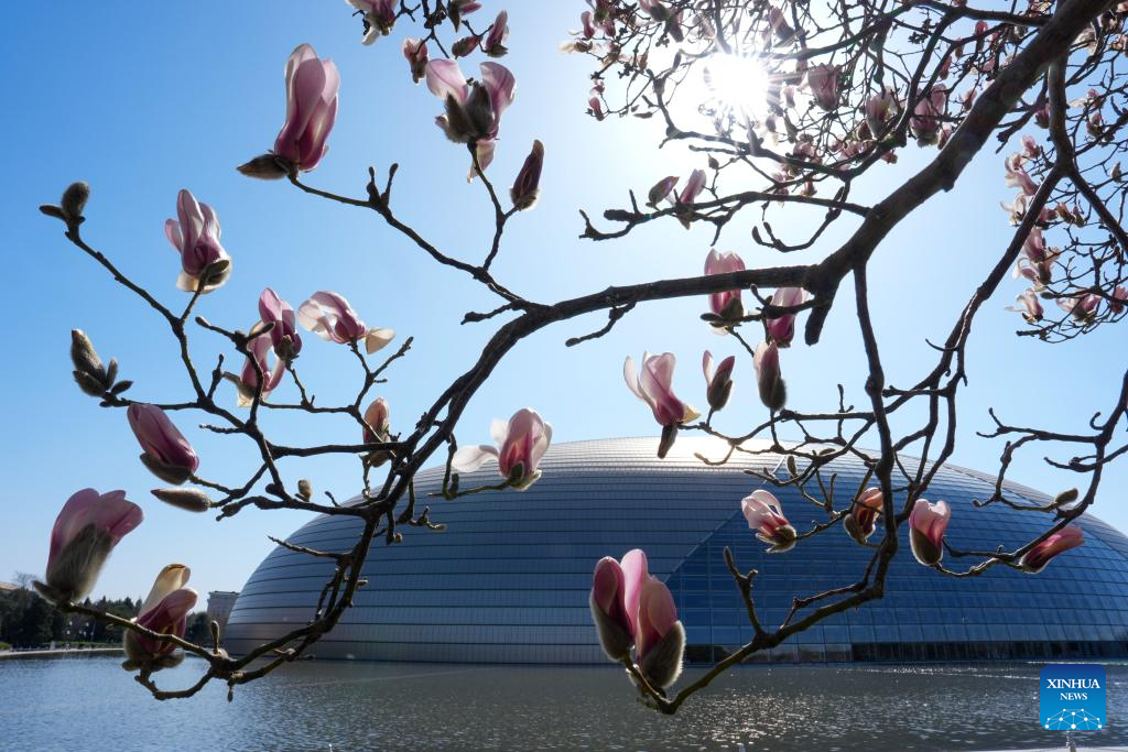 This photo taken on March 9, 2026 shows magnolia blossoms near the National Center for the Performing Arts in Beijing, capital of China. (Xinhua/Ju Huanzong)