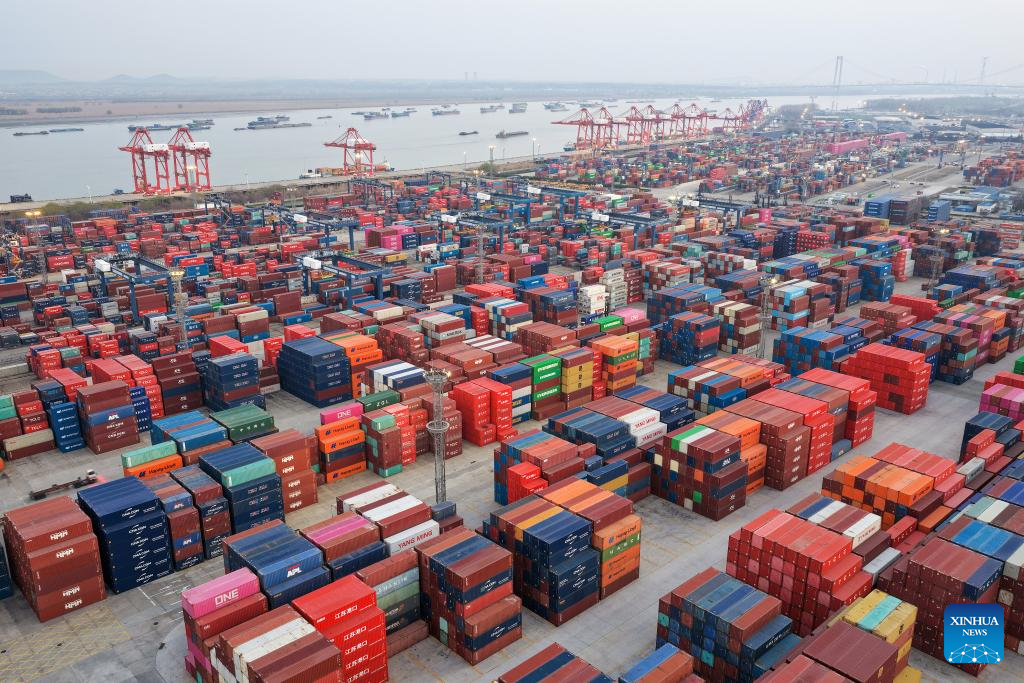 An aerial drone photo taken on March 10, 2026 shows a view of the Longtan Container Terminal at Nanjing Port, east China's Jiangsu Province. China's foreign trade has posted a robust start to the year, with the total value of trade in goods recording double-digit growth, surging 18.3 percent year on year in the January-February period, latest official data showed. (Photo by Fang Dongxu/Xinhua)