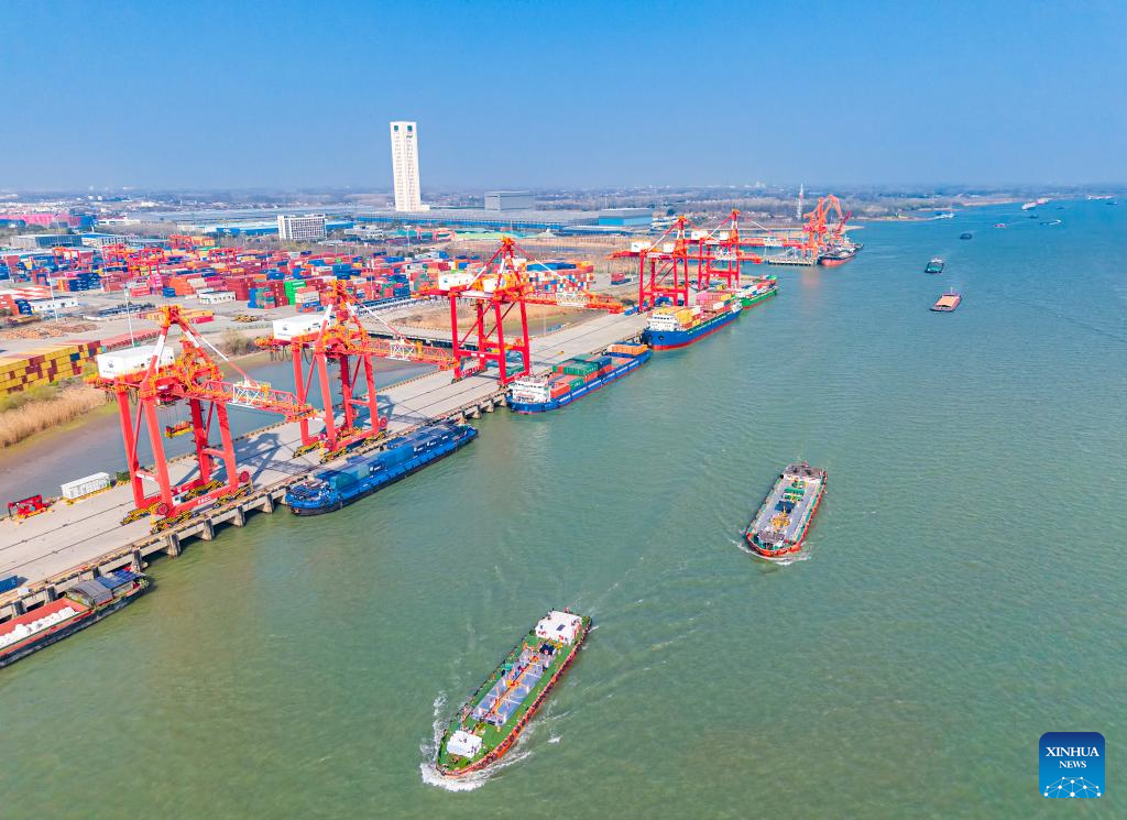 An aerial drone photo taken on March 10, 2026 shows a view of Yangzhou Port in Yangzhou, east China's Jiangsu Province. China's foreign trade has posted a robust start to the year, with the total value of trade in goods recording double-digit growth, surging 18.3 percent year on year in the January-February period, latest official data showed. (Photo by Ren Fei/Xinhua)