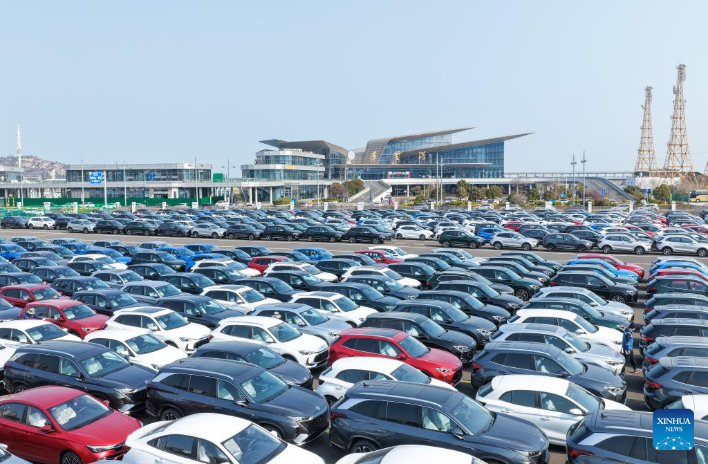 An aerial drone photo taken on March 10, 2026 shows export vehicles at Lianyungang Port, east China's Jiangsu Province. China's foreign trade has posted a robust start to the year, with the total value of trade in goods recording double-digit growth, surging 18.3 percent year on year in the January-February period, latest official data showed. (Photo by Wang Jianmin/Xinhua)