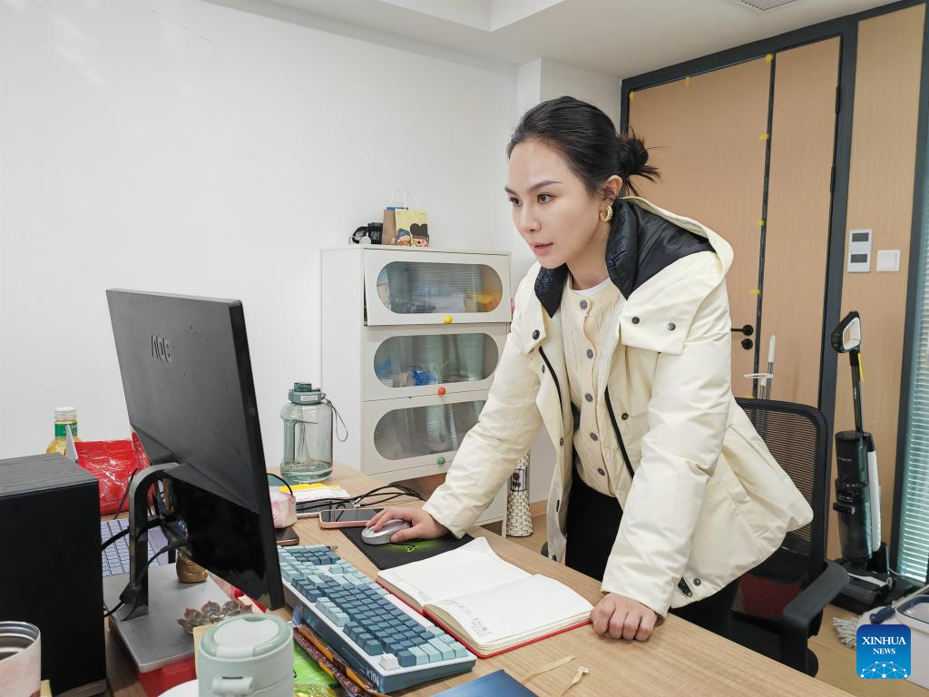 Yang Hanhan processes an AI-generated short film at her studio in Wuhan, central China's Hubei province, March 12, 2026. (Xinhua/Yue Wenwan)