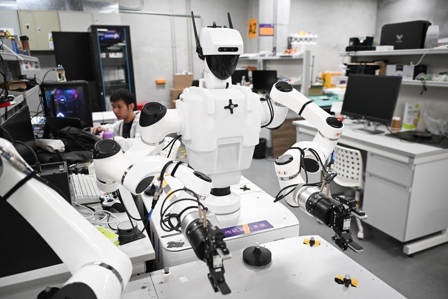 A dual-arm collaborative robot system is pictured at a provincial embodied artificial intelligence robot innovation center in Shenzhen, south China's Guangdong Province, June 25, 2025. (Xinhua/Deng Hua)